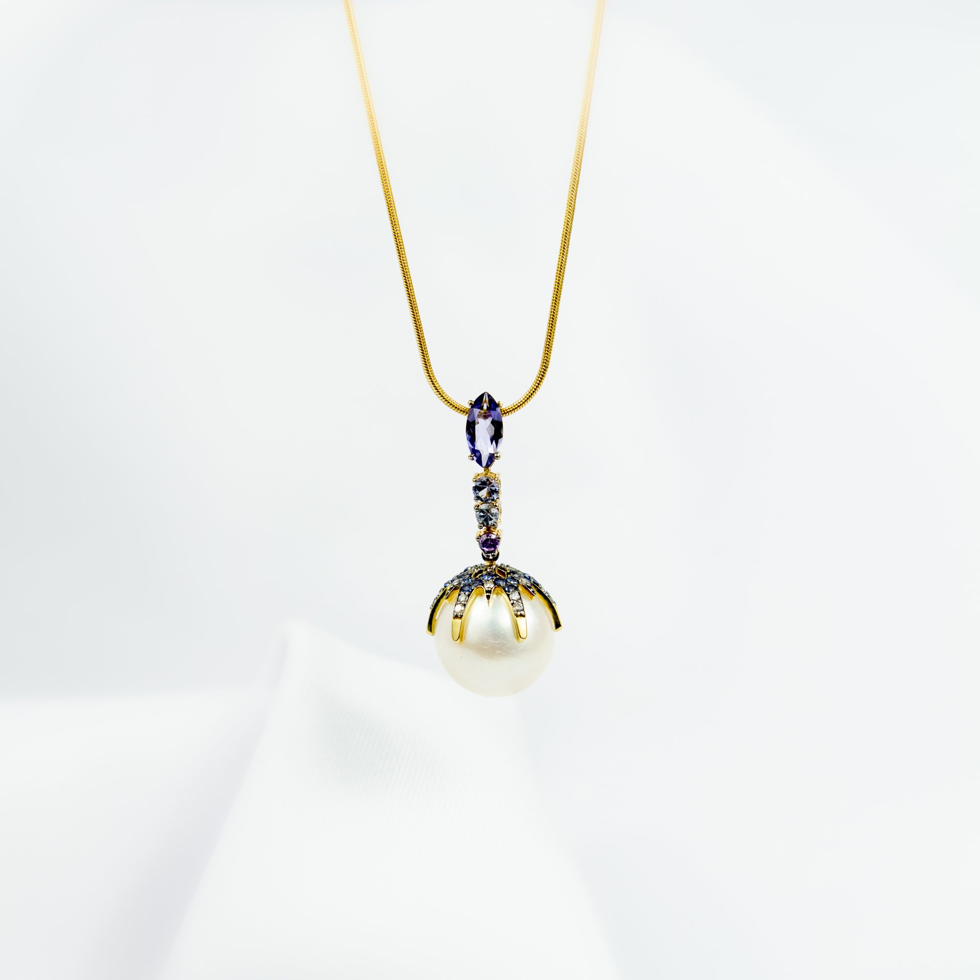 Ouro amarelo com pérola South Sea, safiras, indicolitas, ametistas e diamantes